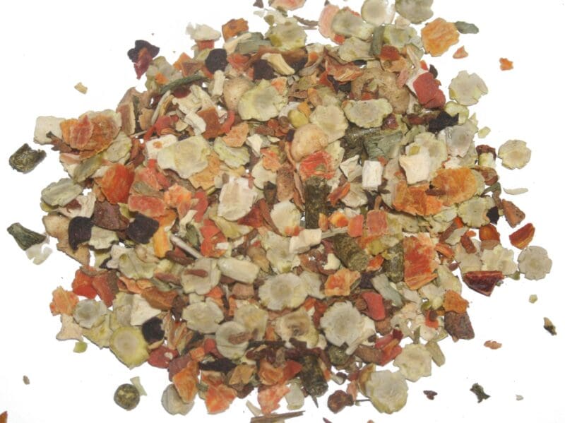 Die Mischung beginnt mit nahrhaften Erbsen- und Möhrenflocken, die reich an Ballaststoffen und Vitaminen sind. Luzerne und Rote Beete liefern wichtige Mineralstoffe und unterstützen die Blutgesundheit. Sellerie- und Kürbisflocken sind bekannt für ihre verdauungsfördernden Eigenschaften und tragen zur allgemeinen Gesundheit bei.
